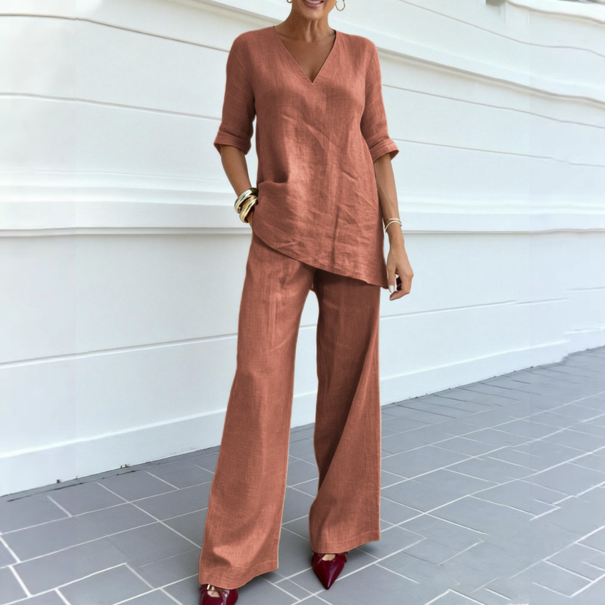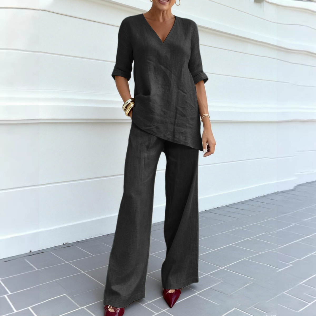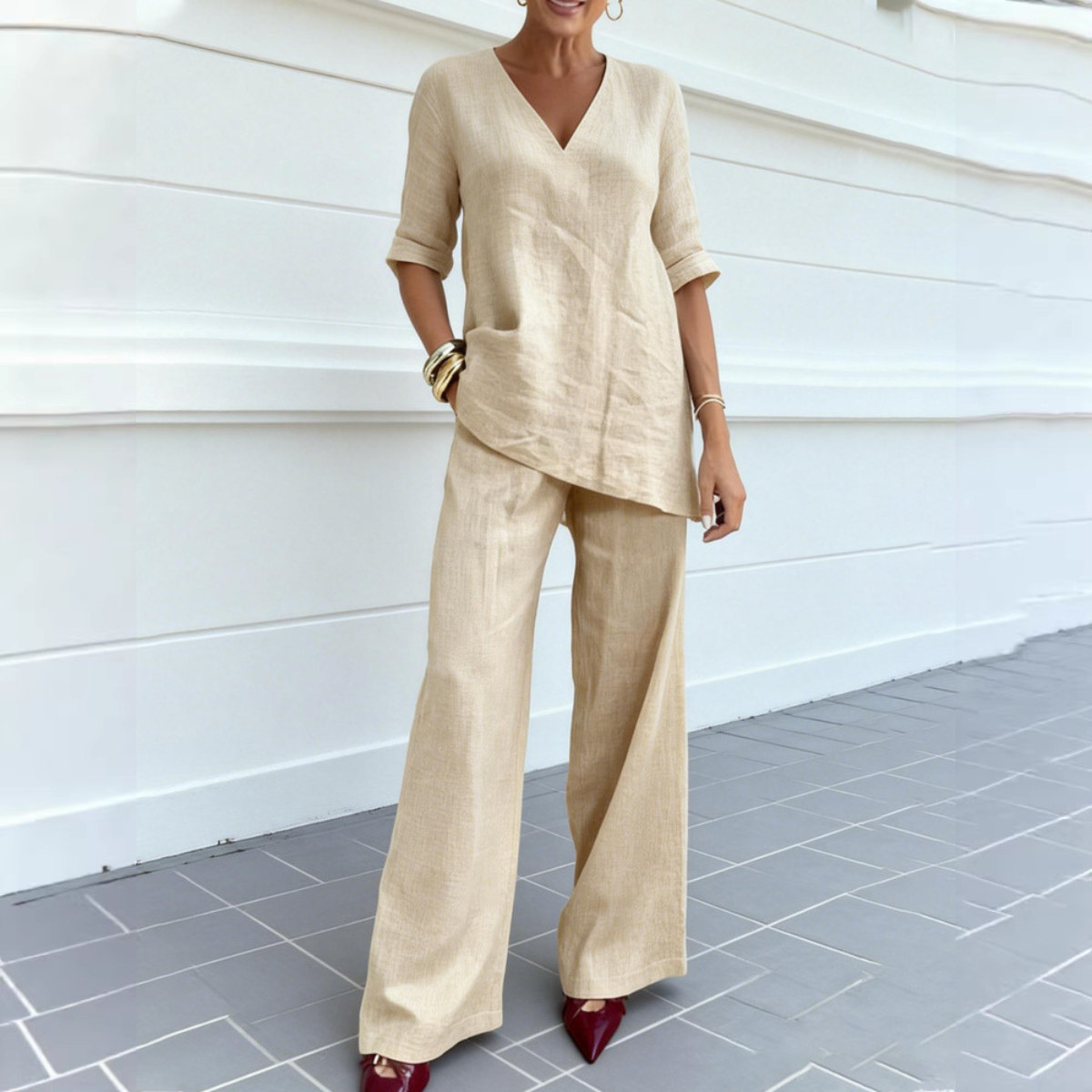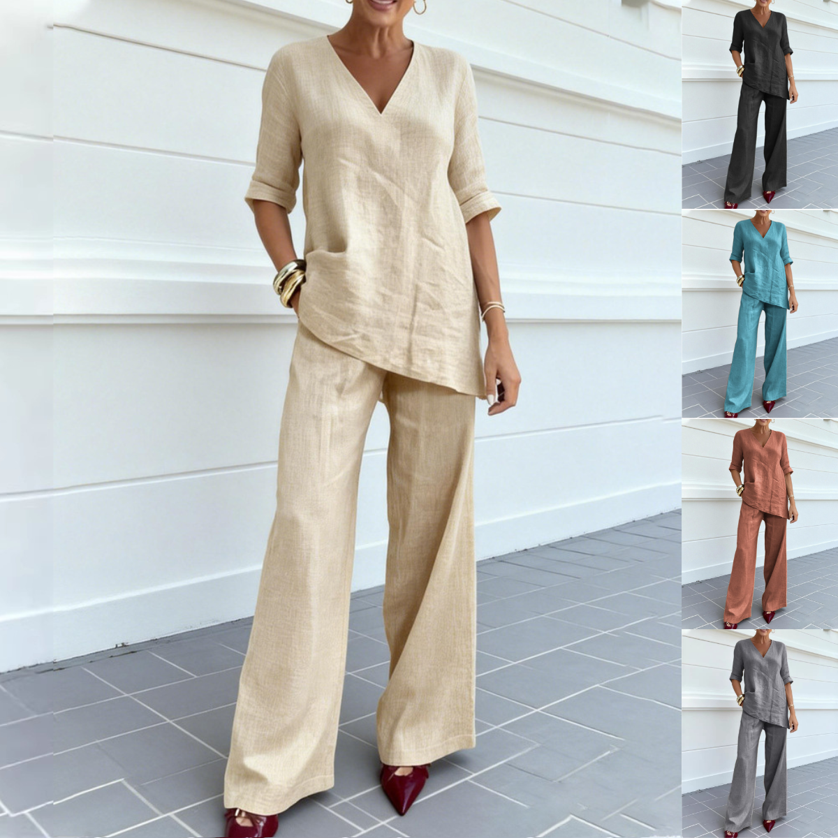 ❤️ 💥【40-100kg】2026 Bawełniano-lniany top w jednolitym kolorze z krótkimi rękawami, dekoltem w serek + proste spodnie casualowe ✅️Płatność przy odbiorze
